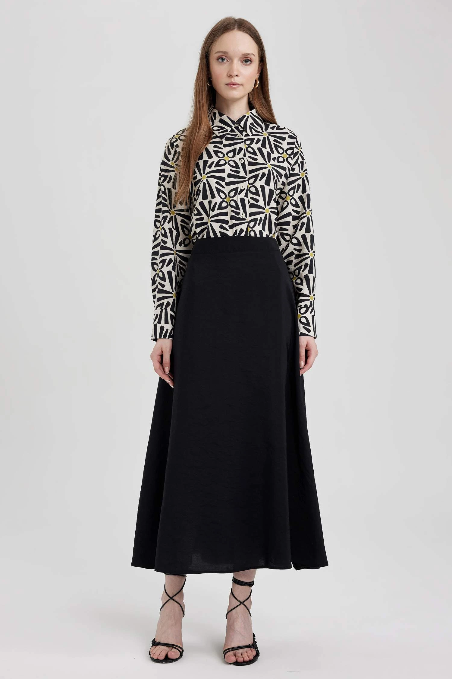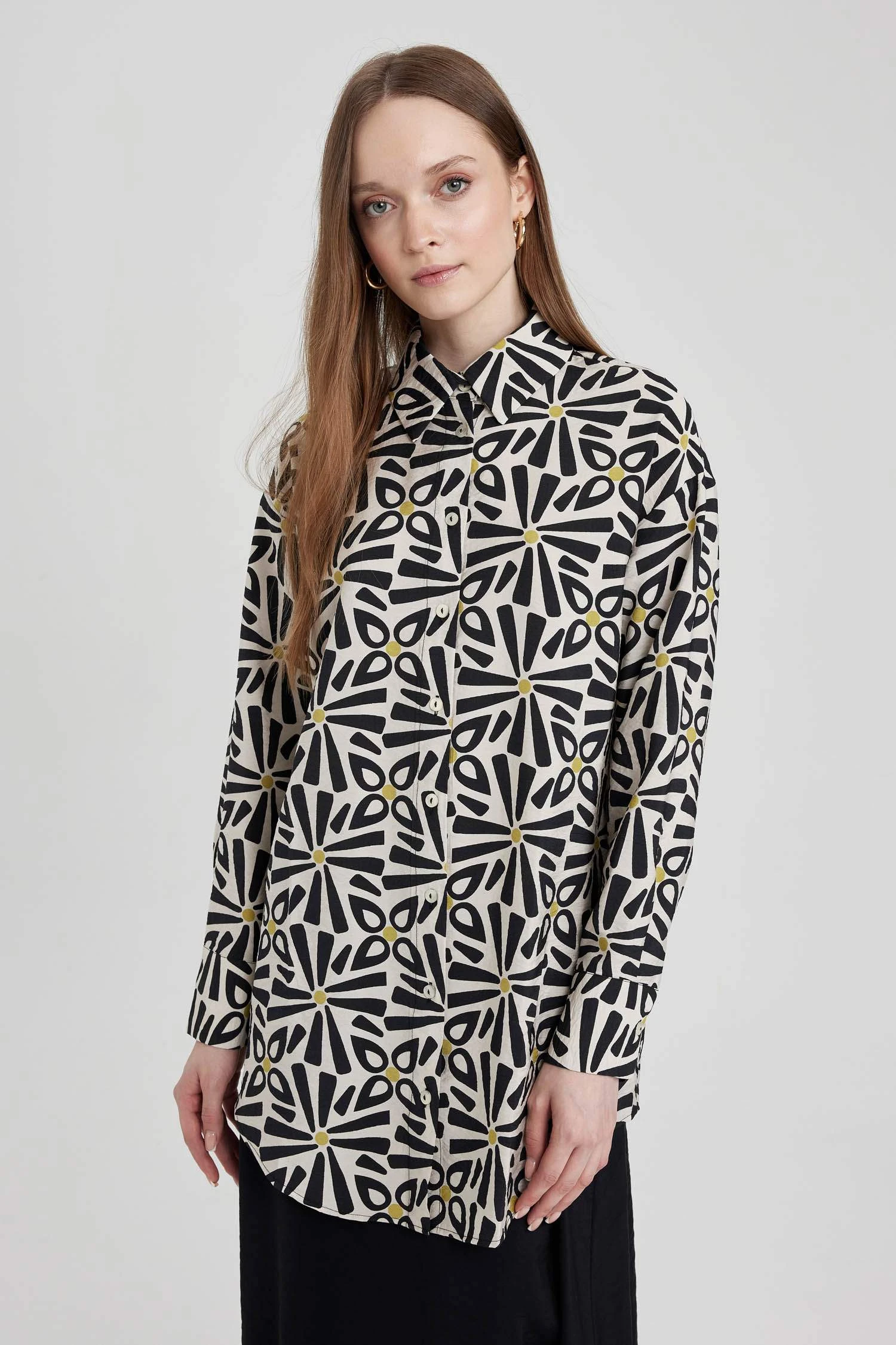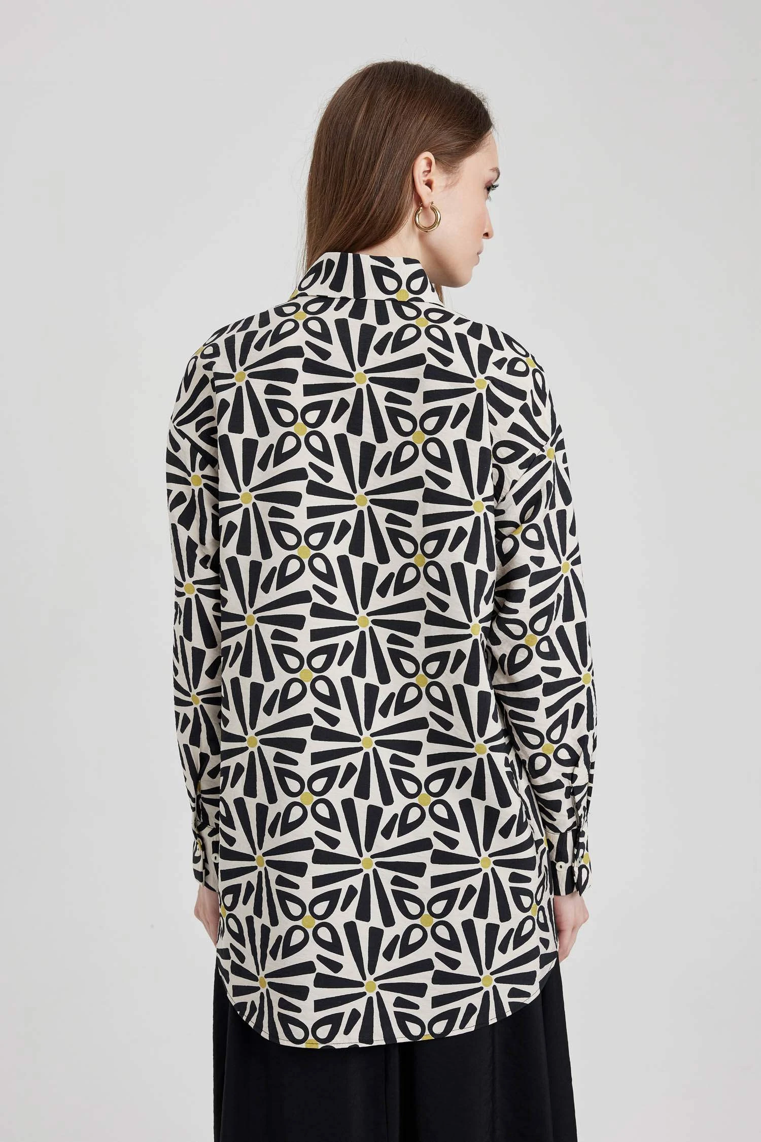 DeFacto Relax Fit Gömlek Yaka Baskılı Uzun Kollu Tunik